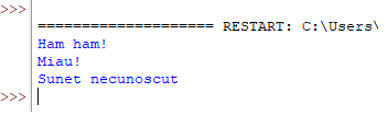 Să începem cu cel mai clasic exemplu de polimorfism: moștenirea și redefinirea comportamentului în clasele derivate. Avem o clasă de bază care definește o metodă, iar clasele care o moștenesc pot redefini acea metodă cu comportament propriu.Analizați cu atenție codul următor: Observăm că apelul animal.vorbeste() se comportă diferit în funcție de tipul efectiv al obiectului, chiar dacă toate apelează aceeași metodă: